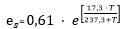 | W= 0,44(e0-ea)(0,253+0,096V) donde: W = peso (en libras) de agua evaporada por pie cuadrado de superficie por hora (lb / ft 2 / hr), eo= Presión de presión de vapor saturado a la temperatura de la superficie de evaporación, psi, ea = presión de vapor del aire, psi, y V = media del aire horizontal o la velocidad del viento medida a una nivel de alrededor de 20 pulgadas más alto que la superficie de evaporación, mph. | E= 5 ( [ Tc + 18]2.5 – r [ Ta+ 18 ]2.5 )(V + 4) x 10-6 E = Evaporation Rate, kg/m2 /hr Tc = Concrete (water surface) Temperature, C Ta = Air Temperature, C r = Relative Humidity (percent)/100 V = Wind Velocity, kph | Tasa Presión saturada vapor de agua [kPa] T=Temperatura en ºC Tasa evaporación [kg/m2/h] eso=Presión de vapor en la superficie de hormigón [kPa] esa=Presión de vapor del aire [kPa] r=Humedad relativa [%]/100 V=Velocidad del viento[km/h] |