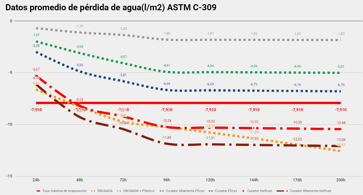 -Siguiendo el criterio de tasa de evaporación máxima de 20,7% que marca la ASTM C-309 en las primeras 72 horas, obtendremos que la tasa máxima de evaporación será de 7,915 l de agua tras la cual ya habremos sobrepasado el límite establecido.