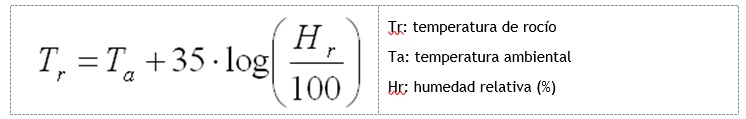 Esta temperatura, temperatura del punto de rocío, es la del soporte por debajo de la cual tiene lugar la condensación. De este modo, la temperatura del soporte deberá ser superior a dicho valor último aumentada en 3 grados. (Ejemplo: para T ambiente = 20ºC y HR = 70 %, la temperatura del soporte deberá ser superior a 17ºC = 14ºC + 3ºC).