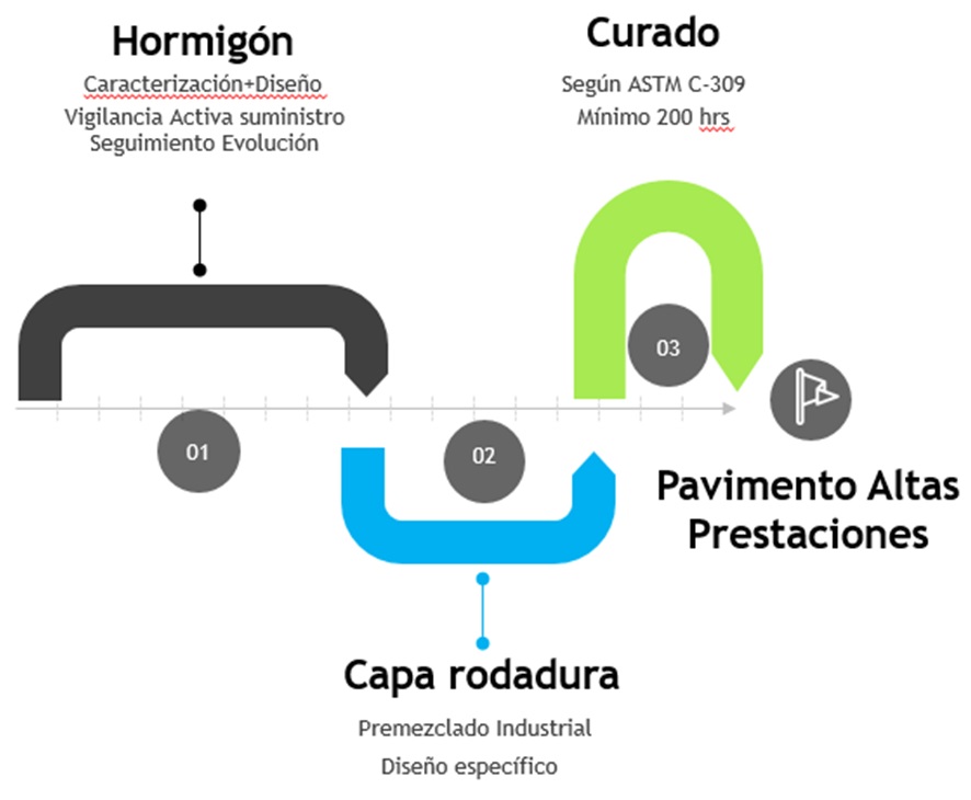 Para obtener unos resultados de “altas prestaciones” en un pavimento debemos recordar que se trata de un sistema combinado “Hormigón-Concreto+Capa rodadura endurecedora+Curado” al que le debemos una multiplicación de las propiedades iniciales y finales del pavimento.