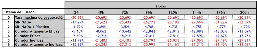 Los resultados monitorizados durante el periodo de curado de 200 horas en pérdidas de % y l/m2 son los siguientes.