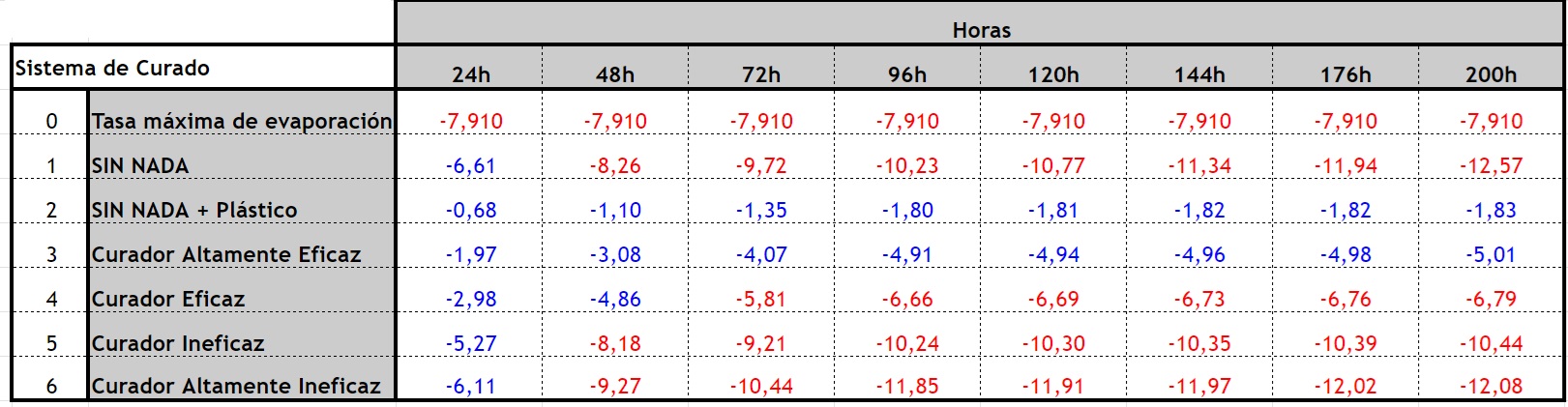 Quiero y debo pronunciarme al respecto: «en el mercado la gran mayoría de sistemas filmógenos curadores no cumplen esas tasas de retención de evaporación en las dotaciones que prometen y lo único que aportan son estética«. Le aconsejamos que estudien y ratifiquen que los sistemas que vayan a emplear procuren evitar fehacientemente esas tasas de evaporación y además no perjudiquen las prestaciones finales del pavimento.