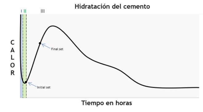 Esta reacción exotérmica ocurre cuando el agua y el cemento reaccionan.