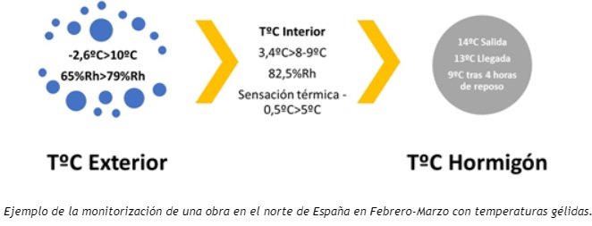 Cuando disponemos de entornos climatológicos desfavorables no solo debemos realizar previsiones, cálculos y medidas previas, sino que lo aconsejable sería generar y poner en práctica “sistemas de vigilancia de la temperatura en el ambiente y en la masa del hormigón-concreto” con el fin de analizar uno de los factores externos que incidirán directamente en la evolución en el o los periodo/s de tiempo estimado.