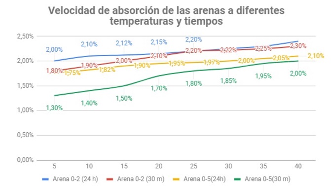 - A la vez una arena que lleve +24 horas a temperatura 30ºC tendrá 2,15% de absorción a 35ºC tendrá 2,25%(+4,65%)